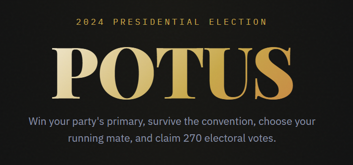 POTUS 2024 is a strategy and simulation game that places players in the role of a presidential candidate navigating a modern election campaign. The game blends political decision-making with resource management, requiring players to balance public opinion, campaign strategy, and key choices that influence the outcome of the election. Its primary purpose is to provide an interactive and thought-provoking experience where players can explore how strategic decisions impact political success in a dynamic and competitive environment.
